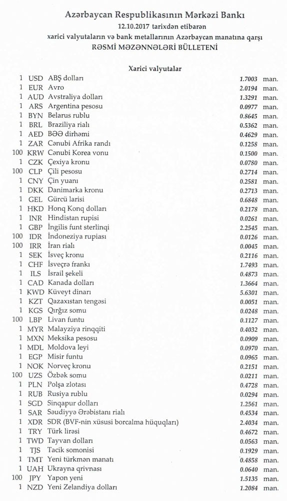 Oktyabrın 12-nə Mərkəzi Bankın açıqladığı rəsmi Dollar/manat məzənnəsi Oktyabrın 11-i ilə müqayisədə dəyişməyərək 1,7003 manat olub, Avro/manat məzənnəsi 2.0194 manata, Rubl/manat məzənəsi isə 0,0294 manatda qalxıb.