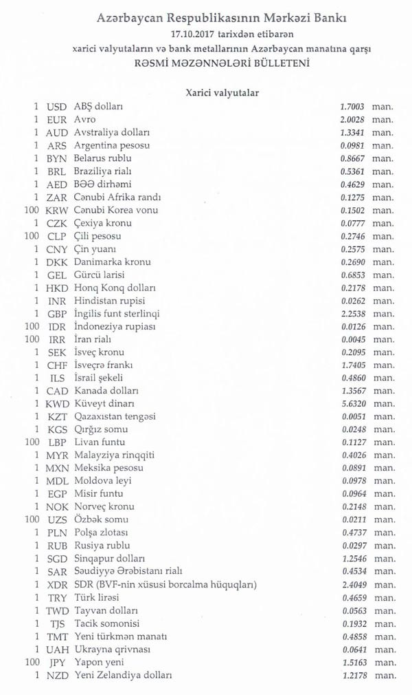 Oktyabrın 17-nə Mərkəzi Bankın açıqladığı rəsmi Dollar/manat məzənnəsi Oktyabrın 16-sı ilə müqayisədə dəyişməyərək 1,7003 manat olub, Avro/manat məzənnəsi 2.0028 manata düşüb, Rubl/manat məzənəsi isə 0,0297 manatdır .