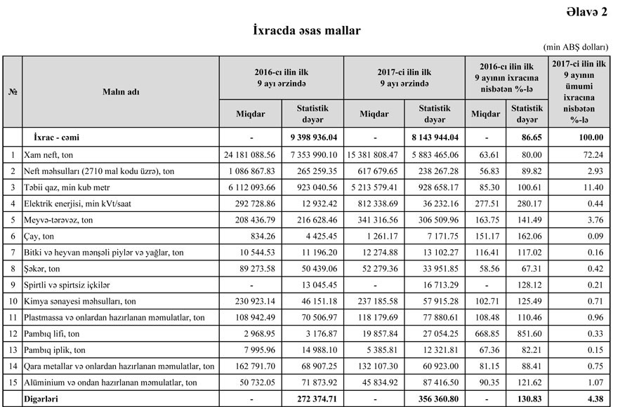 Azərbaycanın 9 aylıq ixracının 72,2%-i xam neftin payına düşüb.