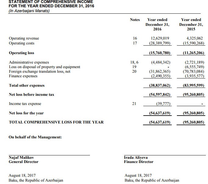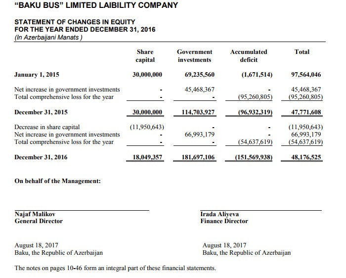 2016-cı ildə “Baku Bus”un əməliyyat (sərnişindaşıma) gəlirləri 12 milyon 629 min manat (2015-ci ilə nisbətən 2,9 dəfə çox), əməliyyat (sərnişindaşıma) xərcləri 28 milyon 390 min manat (82,1% çox), inzibati xərcləri 4 milyon 484 min manat (64,8% çox), məzənnə fərqindən zərəri 31 milyon 862 min manat (55% az), maliyyə xərcləri 2 milyon 49 min manat (36,7% az), mənfəət vergisi ödəmələri isə 40 min manat təşkil edib. Son nəticədə, şirkət ötən ili 54 milyon 638 min manat xalis zərərlə başa vurub. Bu, 2015-ci illə müqayisədə 42,6% azdır. "Baku Bus" MMC 2015-ci ili 95 milyon 260 min manat zərərlə bağlamışdı.