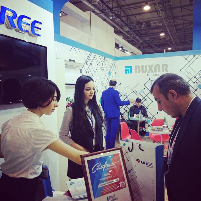 Buxar mühəndislik şirkəti bu ilki sərgidə rəsmi distributoru olduğu Çinin dünya markası olan Gree şirkətinin “VRF xarici blok, alçaq təzyiqli kanal tip, yüksək təzyiqli kanal tip, standart və kompakt kaset tip, konsol tip və divar tip VRF daxili blokları,divar tip multi split daxili bloklar, rekuperator havalandırma qurğuları, mərkəzi və sadə (divar və məsafədən idarə etməli) pultlarıvə bir sıra digər məhsulları ilə iştirak etmişdir.