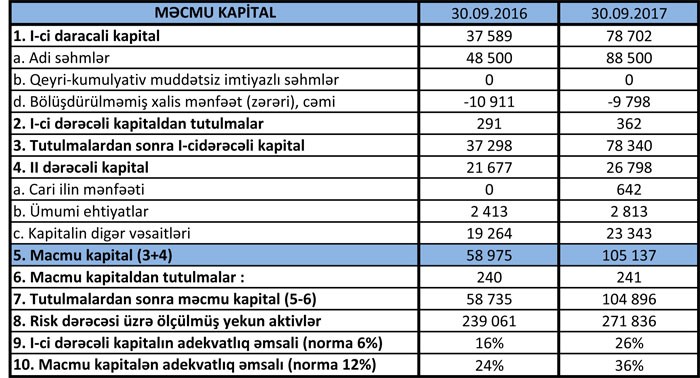Üçüncü rübün sonuna bankın məcmu kapitalı 78,27% artaraq 105 mln. 137 min manat, nizamnamə kapitalı isə 82,47% artaraq 88,500 mln. manat olub.