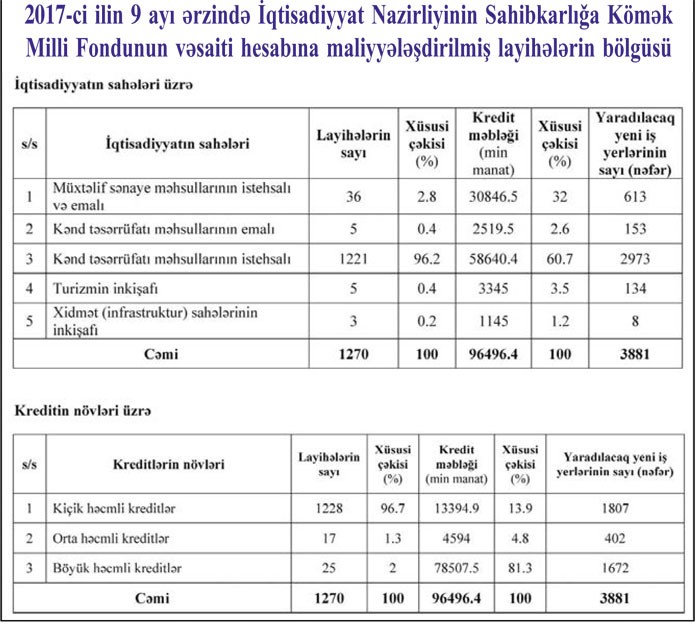 2017-ci ilin 9 ayı ərzində İqtisadi İnkişaf Nazirliyinin Sahibkarlğa Kömək Milli Fondunun vəsaiti hesabına maliyyələşdirilmiş layihələrin bölgüsü açıqlanıb.