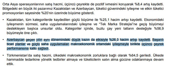 "Azərbaycanda bu ilin 9 ayında satışlarımız ötən ilin eyni dövrü ilə müqayisədə 26% artım qeyd edib. Uğurlu biznes planları, istehlakçı inamında yaxşılaşma, fəal kampaniyalarımız və makroiqtisadi mühitin yaxşılaşması satışa təkan verib",- Şirkətin hesabatında deyilir.