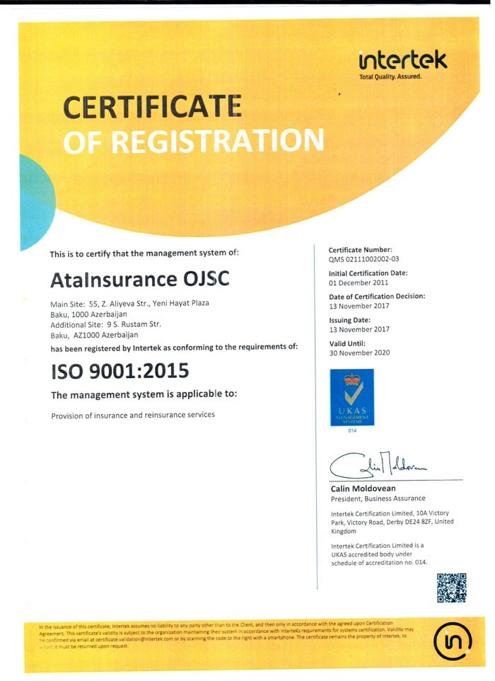“AtaSığorta” ASC növbəti 3 il müddətinə “Intertek” şirkəti tərəfindən yeni ISO 9001:2015 beynəlxalq sertifikatına layiq görülmüşdür. Bu barədə "Marja"ya ASC-dən bildirilib.