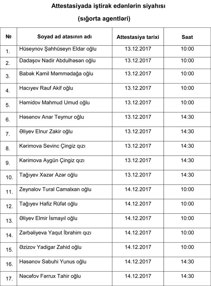 “Sığortaçıların rəhbər işçisi vəzifələrinə namizədlər və müvafiq sığorta vasitəçiliyi üzrə fəaliyyətə lisenziya, həmçinin aktuari fəaliyyətinə aktuari şəhadətnaməsi almaq istəyən fiziki şəxslər üçün attestasiyanın təşkili və keçirilməsi” Qaydalarının 4.1-ci bəndi ilə tənzimlənən attestasiyada 9 nəfər rəhbər şəxsin və 23 nəfər sığorta agentinin iştirakı planlaşdırılır.
