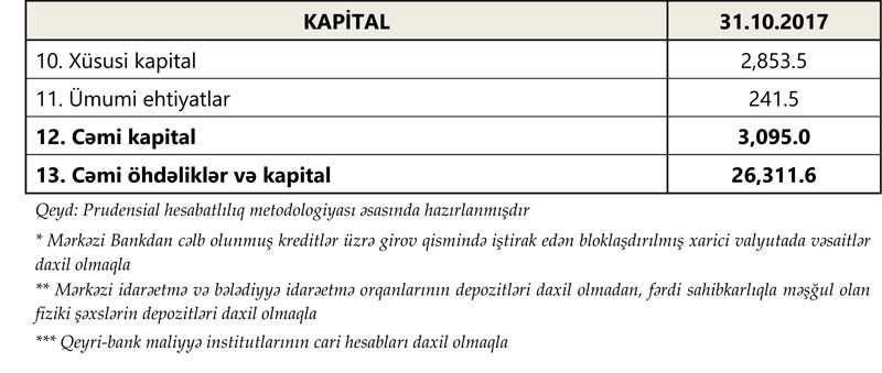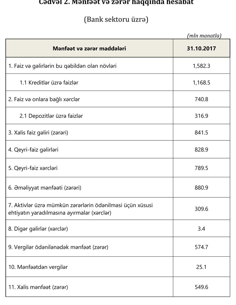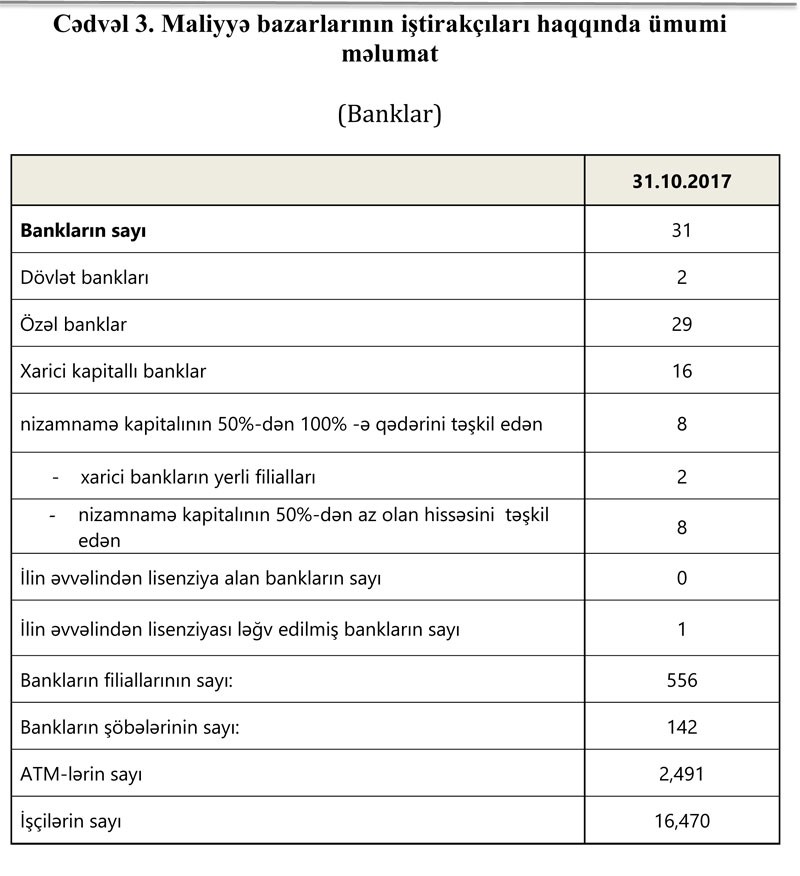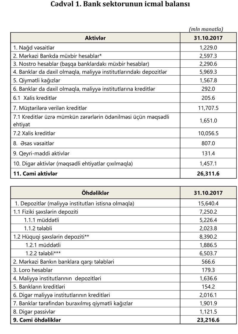 31 oktyabr 2017-ci il tarixinə bank sektorunun əsas göstəriciləri bank sektorunun icmal göstəricilərində öz əksini tapmışdır.