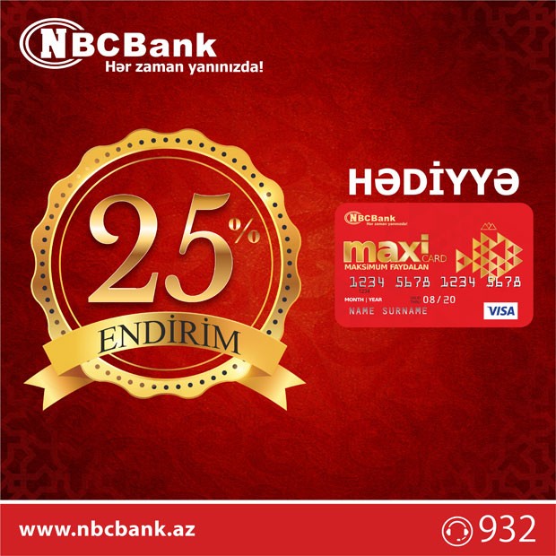 Dekabr ayının 1-dən 30-na qədər nağd istehlak krediti götürən müştərilərə kredit faizlərinə və xidmət haqqına 25 % endirim etməklə yanaşı Maxi Card hədiyyə ediləcək.