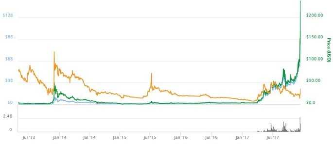 Son bir ilə nəzər saldıqda Litecoin qiymətləri 50-100 dollar ətrafında idi. Ancaq son günlərdə uçuşa keçən Litecoin, sadəcə 24 saat içərisində rekord qıraraq, yüz faiz artımla 246 dollar səviyyəsinə yaxınlaşıb. Arxada qoyduğumuz həftədə başda Bitcoin olmaq üzrə bir çox pul vahidində qiymət artımı baş verib və bu artım Litecoin-ə də təsir edib.
