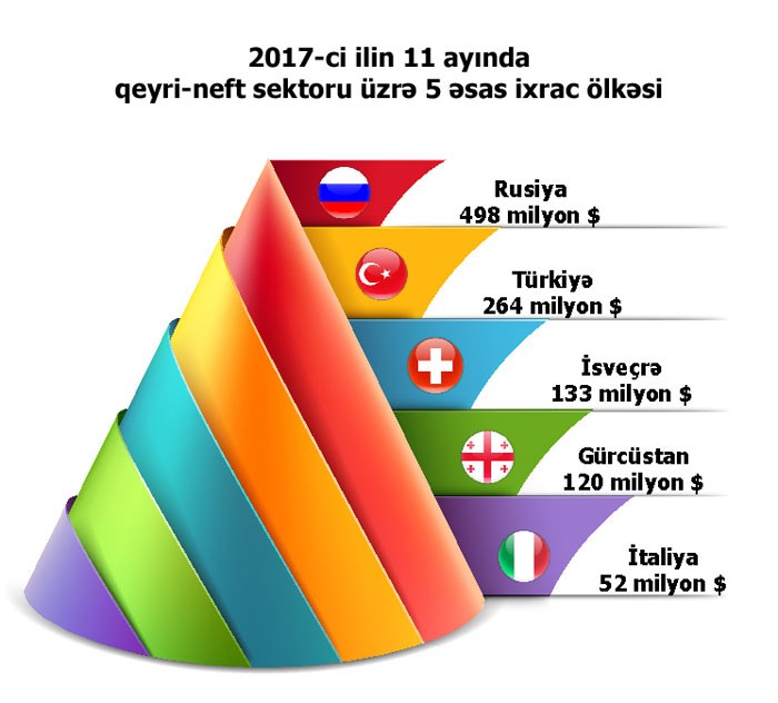 2016-cı ilin müvafiq dövrü ilə müqayisədə qeyri-neft sektoru üzrə ixracın 22 faizdən çox artıb. 2017-ci ilin 11 ayı ərzində ən çox qeyri-neft məhsullarımız Rusiya Federasiyasına ixrac edilib. Belə ki, cari ilin 11 ayı ərzində Rusiyaya 498 milyon, Türkiyəyə 264 milyon, İsveçrəyə 133 milyon, Gürcüstana 120 milyon və İtaliyaya 52 milyon ABŞ dolları dəyərində qeyri-neft sektoruna aid mal ixrac olunub.