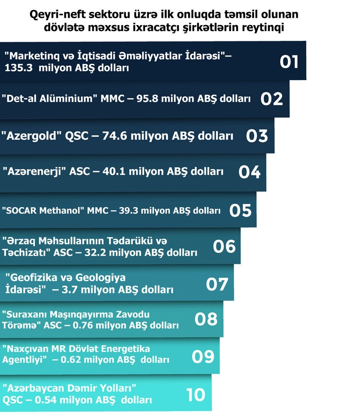 Qeyri-neft sektoru üzrə ixrac əməliyyatlarında iştirak edən dövlətə məxsus şirkətlərin siyahısında isə ilk onluqda ARDNŞ-in “Marketinq və İqtisadi Əməliyyatlar İdarəsi”, “Det-al Alüminium” MMC, “Azergold” QSC, “Azərenerji” ASC, “SOCAR Methanol” MMC, “Ərzaq Məhsullarının Tədarükü və Təchizatı” ASC, ARDNŞ-in “Geofizika və Geologiya İdarəsi”, “Suraxanı Maşınqayırma Zavodu Törəmə” ASC, “Naxçıvan MR Dövlət Energetika Agentliyi” və “Azərbaycan Dəmir Yolları” QSC təmsil olunurlar.