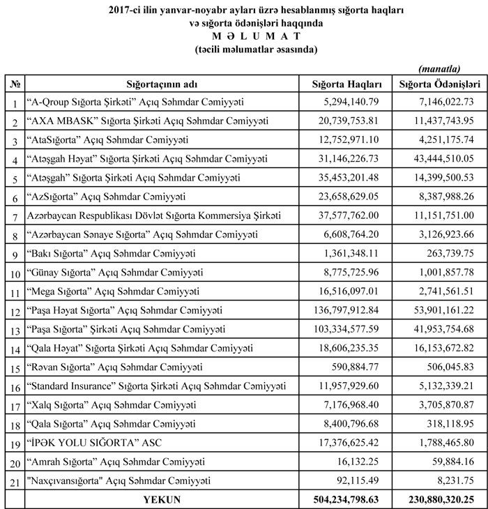 2017-ci ilin yanvar-noyabr ayları ərzində Azərbaycanda fəaliyyət göstərən 21 sığorta şirkəti tərəfindən 504,234,798 milyon manat sığorta haqqı toplanmışdır. Bu, 2016-cı ilin 11 ayı ilə müqayisədə 12,4% çoxdur. Bu barədə "Marja"ya Maliyyə Bazarlarına Nəzarət Palatasından bildirilib.