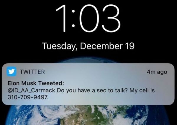 "Marja" xəbər verir ki, Facebook-un virtual gerçəklik təşkilatı Oculus-un yüksək səviyyəli texnologiya rəhbəri (CTO) John Carmack-ə nömrəsini birbaşa göndərmək istəyən Elon Musk, mesajı səhvən hər kəsə açıq paylaşıb.16.7 milyon izləyicisi olan Muskın "tweet"i saniyələr ərzində silinməsinə baxmayaraq, milyonlarla görüntülənib.