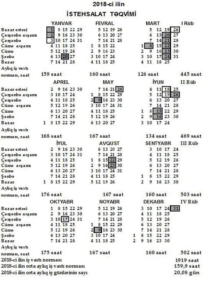 2018-ci ilin İş vaxtı normasında bildirilir ki, Azərbaycan Respublikasının Əmək Məcəlləsinin 105-ci maddəsinin 2-ci hissəsinə və Azərbaycan Respublikasının Nazirlər Kabinetinin “2018-ci ildə Novruz, Ramazan, Qurban bayramları haqqında” 2017-ci il 6 dekabr tarixli 540 nömrəli qərarına əsasən 2018-ci ildə 1, 2 yanvar - Yeni il bayramı, 20 Yanvar - Ümumxalq hüzn günü, 8 Mart– Qadınlar günü, 20, 21, 22, 23, 24 mart –Novruz bayramı, 9 May - Faşizm üzərində Qələbə günü, 28 May - Respublika günü, 15 İyun - Azərbaycan xalqının Milli Qurtuluş günü, 15,16 iyun - Ramazan bayramı, 26 İyun - Azərbaycan Respublikasının Silahlı Qüvvələri günü, 22, 23 avqust - Qurban bayramı, 9 Noyabr - Azərbaycan Respublikasının Dövlət Bayrağı günü və 31 Dekabr - Dünya Azərbaycanlılarının Həmrəyliyi günü iş günü hesab edilmir.