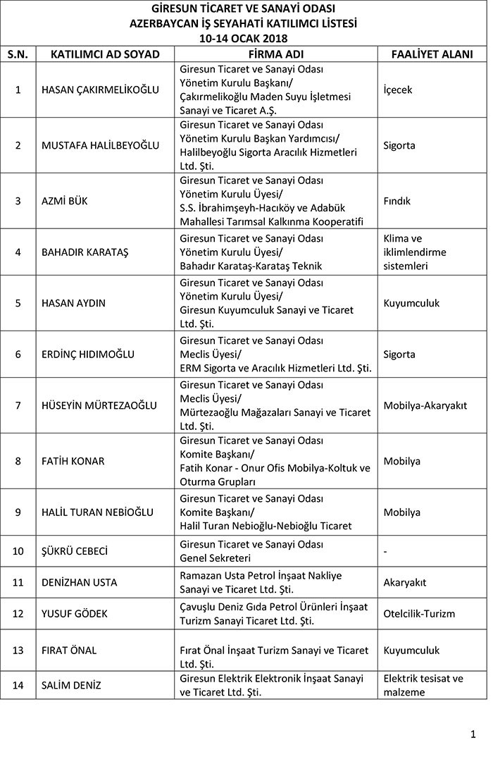 Nümayəndə heyətinə qatılacaq iş adamlarının siyahısı.