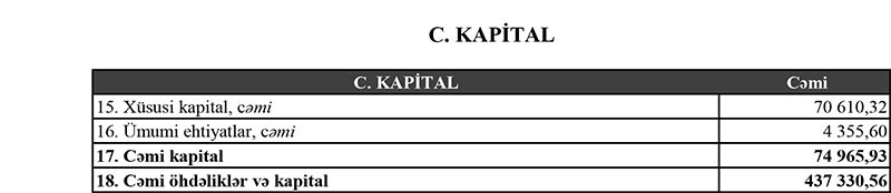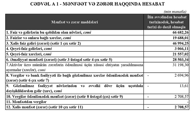 Faiz və qeyri-faiz xərcləri çıxıldıqdan sonra Bankın 28 milyon 503 min manat əməliyyat mənfəəti qalıb. Bank, aktivlər üzrə mümkün zərərlərin ödənilməsi üçün xüsusi ehtiyatın yaradılmasına 31 milyon 198 min manat ayırdığından ötən ili 2 milyon 708 min manat zərər ilə başa vurub.