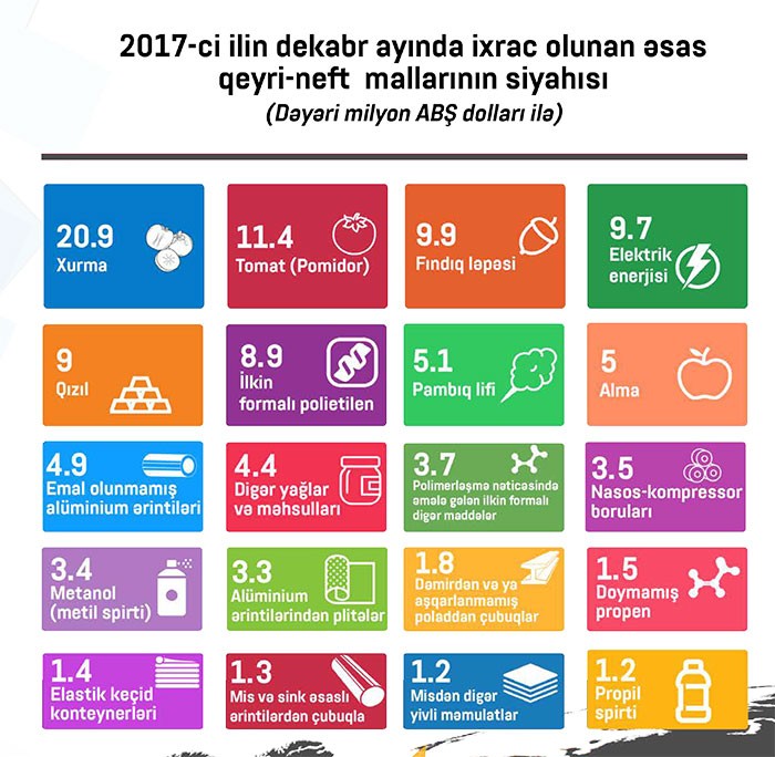 Ötən ilin dekabr ayında qeyri-neft məhsullarının ixrac edildiyi ölkələrin siyahısında ilk beşlikdə Rusiya, Türkiyə, Gürcüstan, İsveçrə və İtaliya təmsil olunmuşdur. Yekunda qeyd edək ki, 2016-cı illə müqayisədə 2017-ci ildə Azərbaycandan ixrac olunun malların çeşidi də 9 faiz çoxalmışdır. İxracın coğrafiyası isə 114 ölkəni əhatə etmişdir
