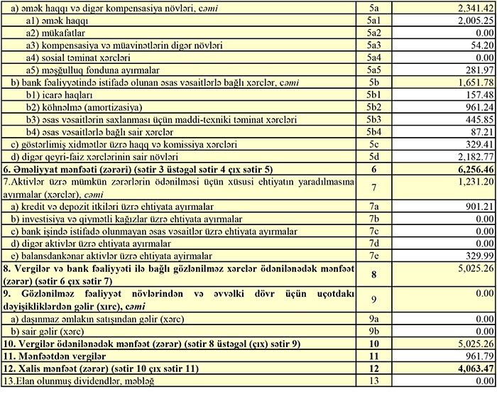 Ötən ilin xalis əməliyyat mənfəətindən ehtiyatlara ayırma çıxıldıqdan sonra 5 milyon 25 min manat vergi ödənilənədək mənfəət qalıb. Bu mənfəətdən 962 min manat mənfəət vergisi ödənilib. Nəticədə Bankın 4 milyon 63 min manat xalis mənfəəti qalıb.