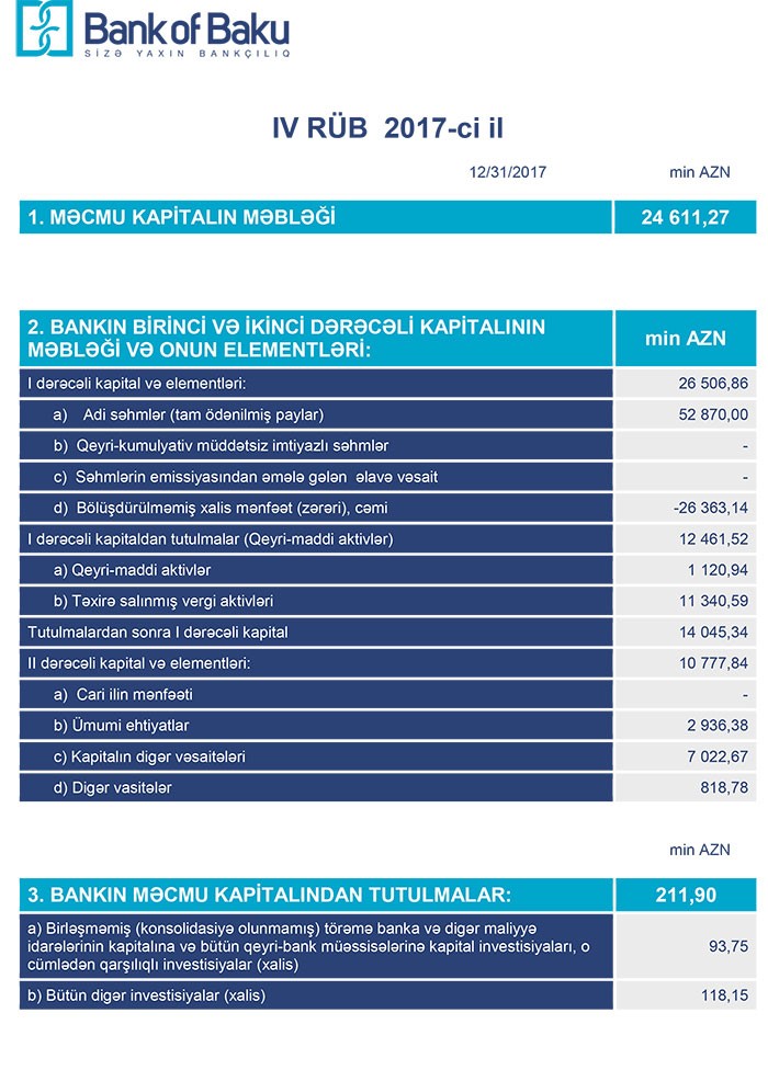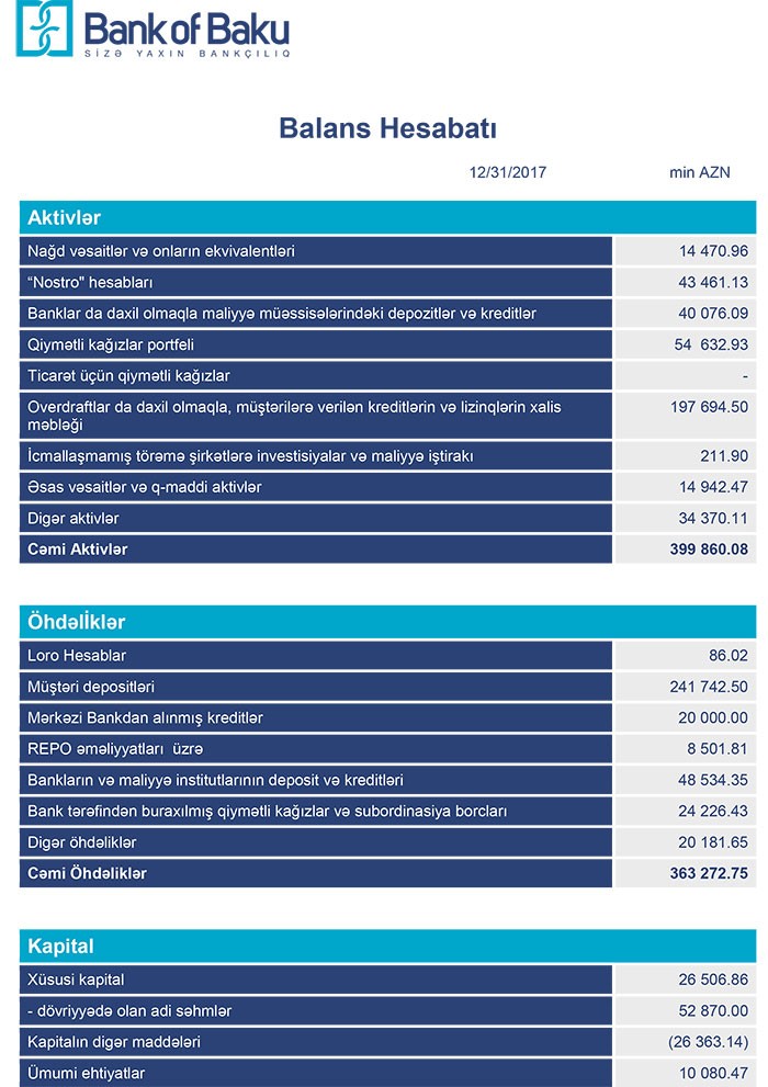 “Bank of Baku” ASC 2017-ci ilin yekunu üzrə maliyyə göstəricilərini açıqlayıb.