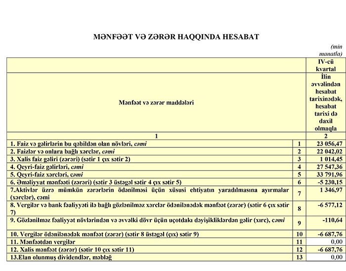 “AgBank” 2017-ci ili 6 milyon 688 min manat zərər ilə başa vurub.
