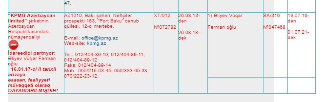 Auditorlar Palatası, Azərbaycan Respublikasının ərazisində fəaliyyət göstərən auditor təşkilatlarının və onların tərkibində fəaliyyət göstərən auditorların 2018-ci il 31 yanvar tarixinə olan Siyahısında qeyd edib ki, “KPMG Azərbaycan limited” şirkətinin Azərbaycan Respublikasındakı nümayəndəliyinin fəaliyyəti 16.01.17-ci il tarixli ərizəyə əsasən müvəqqəti olaraq dayandırılmışdır. Ətraflı: http://marja.az/news/21199