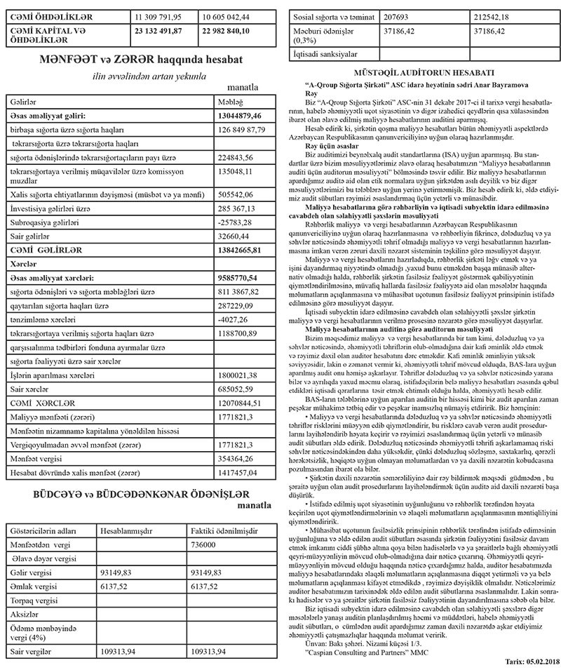 31.12.2017-ci il tarixinə “A-Qroup Sığorta Şirkəti”nin cəmi aktivləri 22 milyon 983 min manat, cəmi öhdəlikləri 10 milyon 605 min manat, cəmi kapitalı isə 12 milyon 378 min manat təşkil edib.