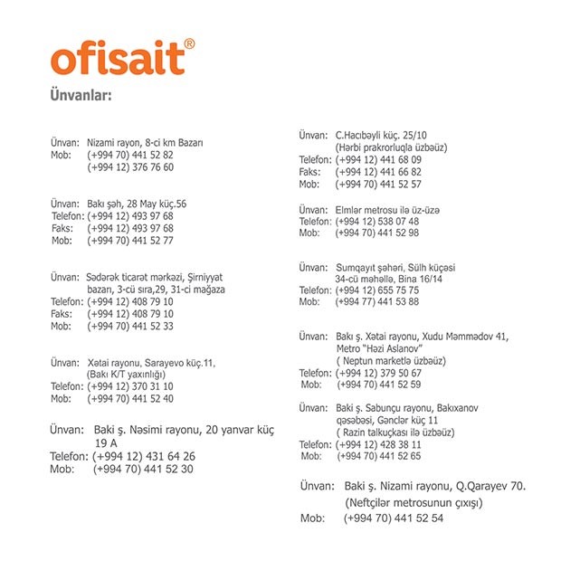 Ekoloji sağlam OYAL məktəbli ləvazimatlarını Bakı və bölgələrdə 30-a yaxın filialı olan “Ofisait” mağazaları ilə yanaşı, şəhərimizin dəftərxana ləvazimatları satılan bir çox mağazalarından əldə etmək mümkündür. Həmçinin ölkənin ən böyük online satış portallarından biri olan www.ofisait.com vasitəsilə də Siz mənzil və ofislərinizdə internet vasitəsilə istənilən məhsulu sifariş verə bilərsiniz. “Ofisait”in gülərüz və dinamik komandası Sizin sifarişinizi operativ olaraq qeyd etdiyiniz ünvana təslim edir. Ödənişlərin nəğd və online həyata keçirilməsi mümkündür.