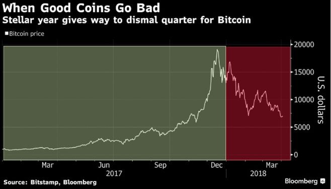 "Marja" xəbər verir ki, ötən il 1400 faiz qazanc təmin edən Bitcoin, 2018-in ilk rübündə yarıdan çox ucuzlaşıb. Bitstamp tərəfindən toplanan qiymət göstəricisinə görə, bu, Bitcoin-in indiyədək bir ilə etmiş olduğu ən pis başlanğıcdır.