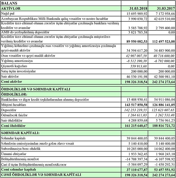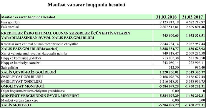 Bank 2017-ci ili 1 milyon 450 min manat zərər ilə bağlamışdı. Bankın zərərinin əsas səbəbi gəlirin kreditlər üzrə ehtimal olunan zərərlər üçün ehtiyatlara yönəldilməsi və xərclərin yüksək olmasıdır.