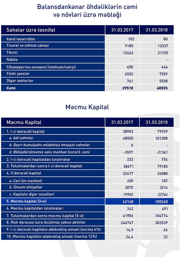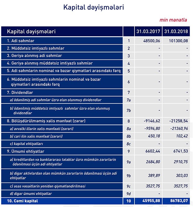 2018-ci ilin ilk 3 ayında “RabitəBank”ın səhmdar kapitalı 12 milyon 800 min manat artaraq 101 milyon 300 min manata, cəmi balans kapitalı isə 13 milyon 394 min manat artaraq 86 milyon 783 min manata çatıb. Bankın məcmu kapitalı isə 92 milyon 195 min manatdan 104 milyon 774 min manata yüksəlib.
