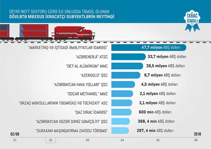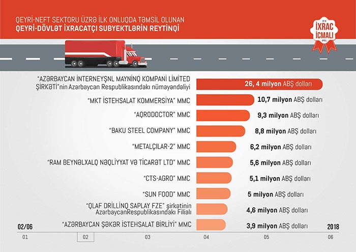 2018-ci ilin I rübündə qeyri-neft sektoru üzrə qeyri-dövlət ixracatçı şirkətlərin siyahısında ilk onluqda “Azərbaycan İnterneyşnl Mayninq Kompani Limited Şirkəti”nin Azərbaycan Respublikasındakı nümayəndəliyi, "MKT İstehsalat Kommersiya" MMC, "Aqrodoctor" MMC, "Baku Steel Company" MMC,"Metalçılar-2" MMC, "Ram Beynəlxalq Nəqliyyat və Ticarət LTD" MMC, “CTS-Agro” MMC, "Sun Food" MMC, “Qlaf Drillinq Saplay FZE” şirkətinin Azərbaycan Respublikasındakı Filialı və "Azərbaycan Şəkər İstehsalat Birliyi" MMC.