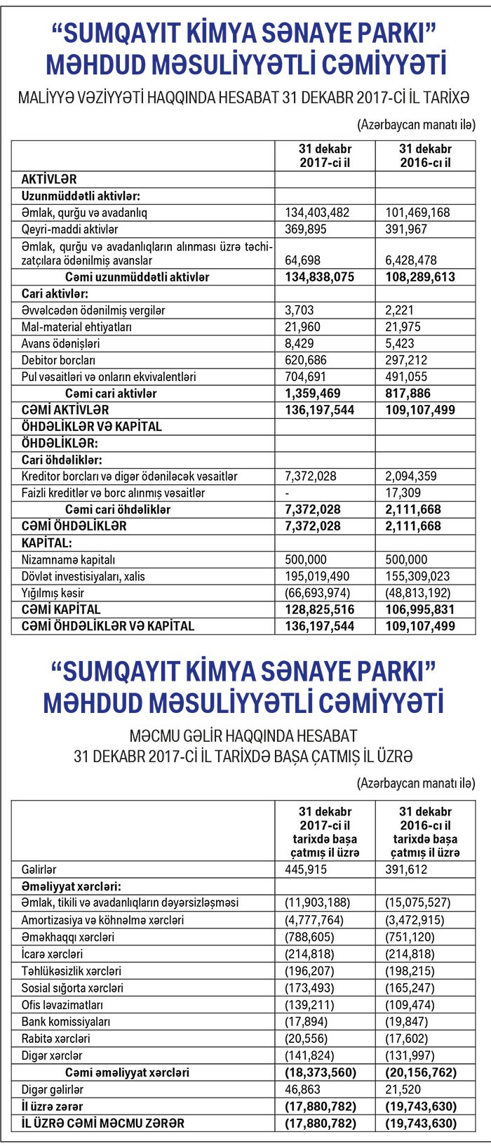 "Sumqayıt Kimya Sənaye Parkı" dövlət investisiyaları hesabına fəaliyyət göstərir. Dövlətin MMC-yə investisiyaları 195 milyon 19 min manata çatıb. Yığılmış zərər bu investisiyaların bir hissəsini silib və cəmi kapital ötən ilin sonunda 128 milyon 825 min manat təşkil edib. Parkın yığılmış zərəri 66 milyon 693 min manata çatıb.