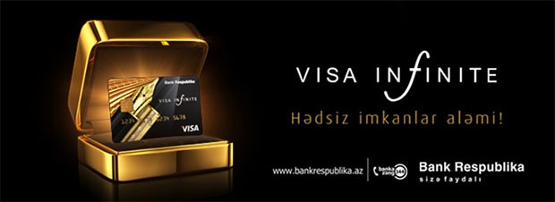 Bu kart Visa ödəniş sisteminin məhsulları sırasında prestijinə görə ən yüksək pillədədir və maksimum sayda üstünlükləri var. Bu kartı Bank Respublikadan əldə etdikdə hədsiz imkanlar aləmi və fərdi güzəştlər paketinə sahib olacaqsınız. Dünya üzrə bütün ödənişləri rahatlıqla onlayn aparmaq olar. Ailənizlə birlikdə tibbi sığorta səyahət zamanı Visa İnfinite paketinə daxil edilir. İndi şopinqdən həzz almaqla yanaşı əmin ola biləcəksiniz ki, alışlarınız da sığortalıdı (xarab olma, yolda zədələmədən).