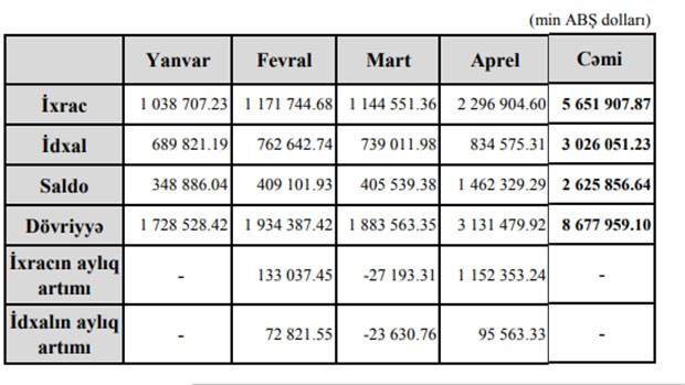 Mart ayı ilə müqayisədə Apreldə ixrac 2 dəfə artaraq 2 milyard 296 milyon 904 min dollar təşkil edib. Martda ixrac 1 milyard 144 milyon 551 min dollar təşkil etmişdi.