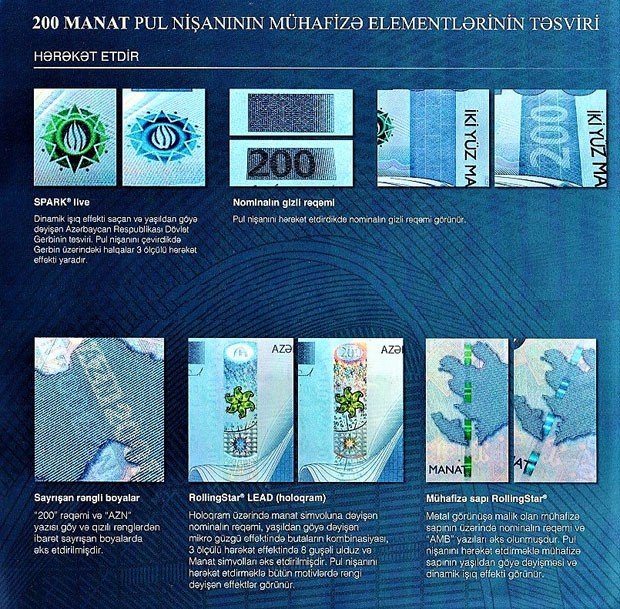 E.Rüstəmov bildirib ki, bu gün Mərkəzi Bank mövzusu müstəqil Azərbaycanın memarı ümummilli liderin xatirəsinə inşa edilmiş “Heydər Əliyev Mərkəzi” olan 200 manatlıq kağız pul nişanını tədavülə tədqim edir. Yeni banknotun üzərində ölkəmizin, paytaxtımızın ən müasir simvollarından biri olan Heydər Əliyev Mərkəzinin əzəmətli təsviri, Mərkəzin əsas eksteryer və interyerinin dizayn elementləri, milli xalça nümunələrinin elemetləri, digər milli ornamentlər əks olunmuşdur.