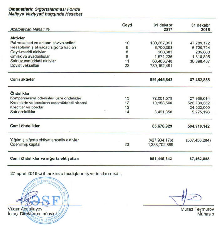 Fond yığılmış sığorta ehtiyatlarını itirib, hətta 472 milyon 934 min manat kəsir yaranıb. Kəsir fondun 1 milyard 334 milyon manatlıq ödənilmiş kapitalı hesabına bağlanıb. Həmçinin kəsir Fondun zərərdə olduğuna işarədir.