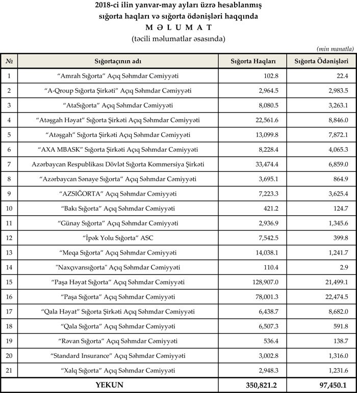 2018-ci ilin yanvar-may ayları ərzində ölkədə fəaliyyət göstərən 21 sığorta şirkəti tərəfindən 350.8 mln. manat məbləğində sığorta haqları toplanıb, 97.5 mln. manat məbləğində sığorta ödənişi həyata keçirilib.