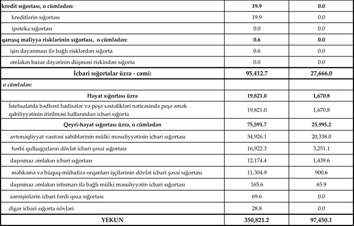 Könüllü sığorta bazarı üzrə haqlar 255.4 mln. manat, ödənişlər isə 69.8 mln. manat təşkil edib. İcbari sığorta bazarı üzrə haqlar 95.4 mln. manat, ödənişlər isə 27.7 mln. manat olub.