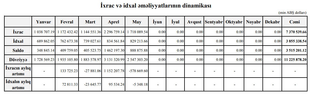 Müqayisə üçün qeyd edək ki, 2017-ci ilin yanvar-may ayları ərzində Azərbaycanın xarici ticarət əməliyyatlarının həcmi 7 milyard 266 milyon 952 min ABŞ dolları, o cümlədən idxal 2 milyard 816 milyon 867 min dollar, ixrac 4 milyard 450 milyon 84 min dollar, saldo isə 1 milyard 633 milyon 217 min dollar təşkil etmişdi. Azərbaycanın bu ilin 5 ayındakı ixracı ötən ilin eyni dövründəki cəmi xarici ticarət dövriyyəsini keçib.