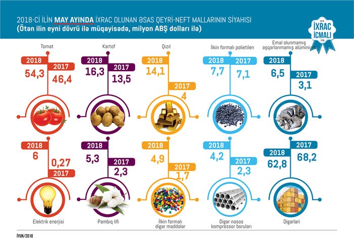 Cari ilin may ayında isə qeyri-neft sektoru üzrə ixrac 182 milyon ABŞ dolları təşkil edib. 2018-ci ilin may ayında ən çox qeyri-neft sektoruna aid mal ixrac edilən ölkələrin siyahısında ilk beşlikdə Rusiya (87,8 milyon ABŞ dolları),Türkiyə (27,1 milyon ABŞ dolları), İsveçrə (16,9 milyon ABŞdolları), Gürcüstan (13,5 milyon ABŞ dolları) və Niderland (6,3 milyon ABŞ dolları) qərarlaşıb.