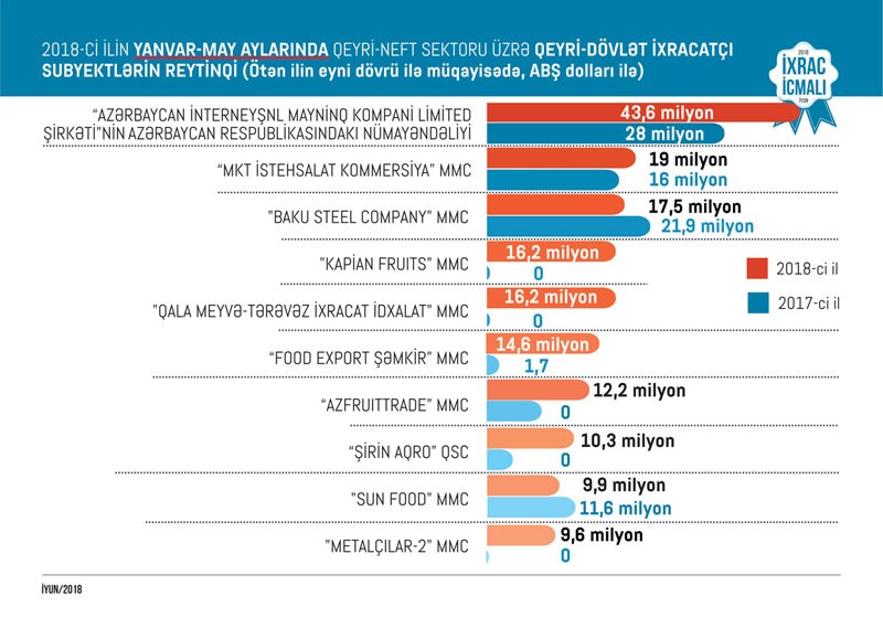 "Marja" İcmala istinadən xəbər verir ki, 2018-ci ilin yanvar-may aylarında qeyri-neft sektoru üzrə qeyri-dövlət ixracatçı şirkətlərin siyahısında ilk onluqda “Azərbaycan İnterneyşnl Mayninq Kompani Limited Şirkəti”nin Azərbaycan Respublikasındakı nümayəndəliyi, "MKT İstehsalat Kommersiya" MMC, "Baku Steel Company" MMC, "Kapitan Fruits" MMC, "Qala meyvə-tərəvəz ixracat idxalat" MMC, “Food Export Şəmkir” MMC, “Azfruittrade” MMC, “Şirin Aqro” QSC, "Sun Food" MMC, "Metalçılar-2" MMC təmsil olunub.