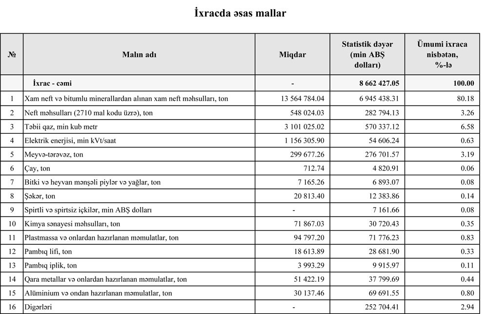 Ötən ilin birinci yarısında 9 707 174 ton xam neftin statistik dəyəri 3 milyard 839 milyon 227 min dollar təşkil etmişdi. Bu ilin birinci yarısında 13 564 784 ton xam neftin statistik dəyəri 6 milyard 945 milyon 438 min dollar təşkil edib (dəyər baxımdan 81% artıb). Statistik dəyərin artmasının əsas səbəbi xam neft qiymətlərinin yüksəlməsidir.