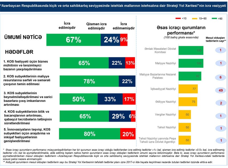 2017-ci il ərzində “Azərbaycan Respublikasının kiçik və orta sahibkarlıq səviyyəsində istehlak mallarının istehsalı üzrə Strateji Yol Xəritəsi”ndə müəyyən edilmiş tədbirlərin 2017-ci ilə nəzərdə tutulmuş hissəsinin 67 faizinin icrası tamamlanmış, 24 faizi qismən icra edilmiş, 9 faizi isə icra edilməmişdir. Ətraflı burada.