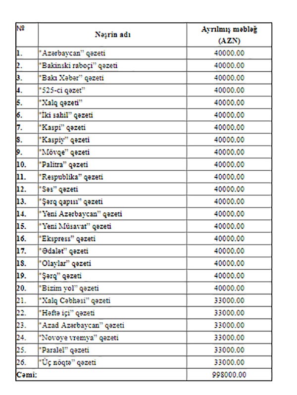 26 gündəlik qəzetə 998 min manat verildi - SİYAHI