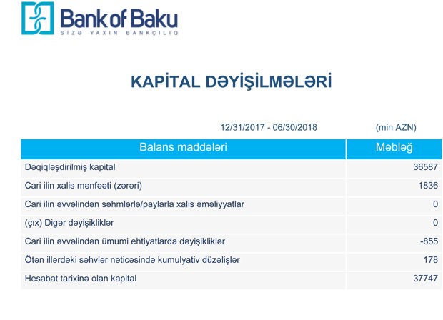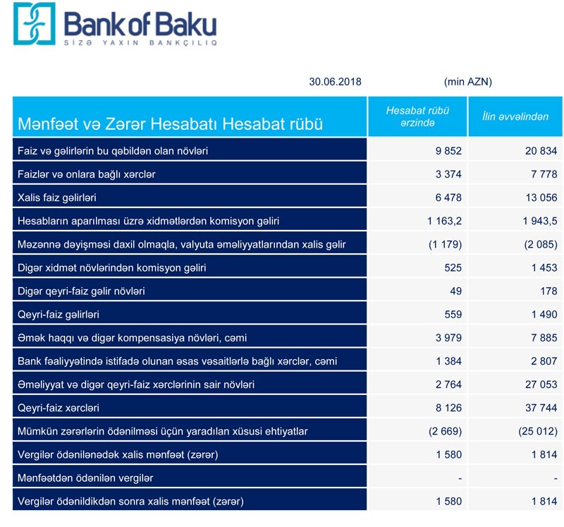 Müqayisə üçün qeyd edək ki, 2017-ci ilin 1-ci yarısında "Bank of Baku"nun faiz gəlirləri 32 milyon 198 min manat, qeyri-faiz gəlirləri 150 min manat təşkil etmiş, mümkün zərərlərin ödənilməsi üçün yaradılan xüsusi ehtiyatlara 32 milyon 727 min manat ayrıldığından Bank 26 milyon 41 min manat zərər açıqlamışdı.