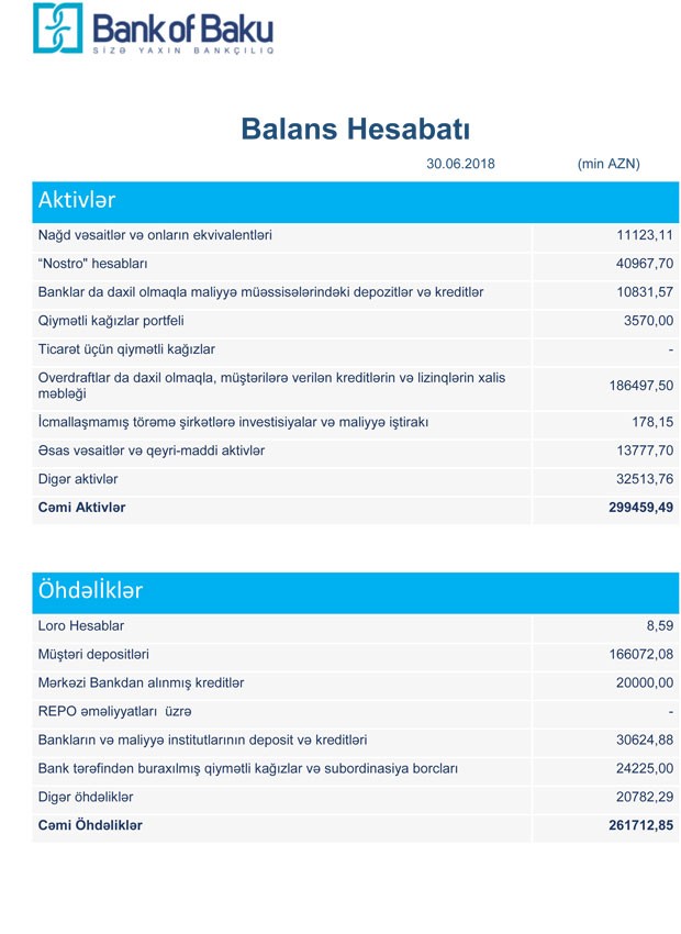 30 İyun 2018-ci il tarixində “Bank of Baku” 299 milyon 459 min manat cəmi aktivlərə (o cümlədən 186 milyon 497 min manatı müştərilərə verilmiş kreditlər), 261 milyon 712 min manat cəmi öhdəliklərə (o cümlədən 166 milyon 72 min manatı müştərilərin depozitləri) və 37 milyon 746 min manat cəmi balans kapitalına malik olub.