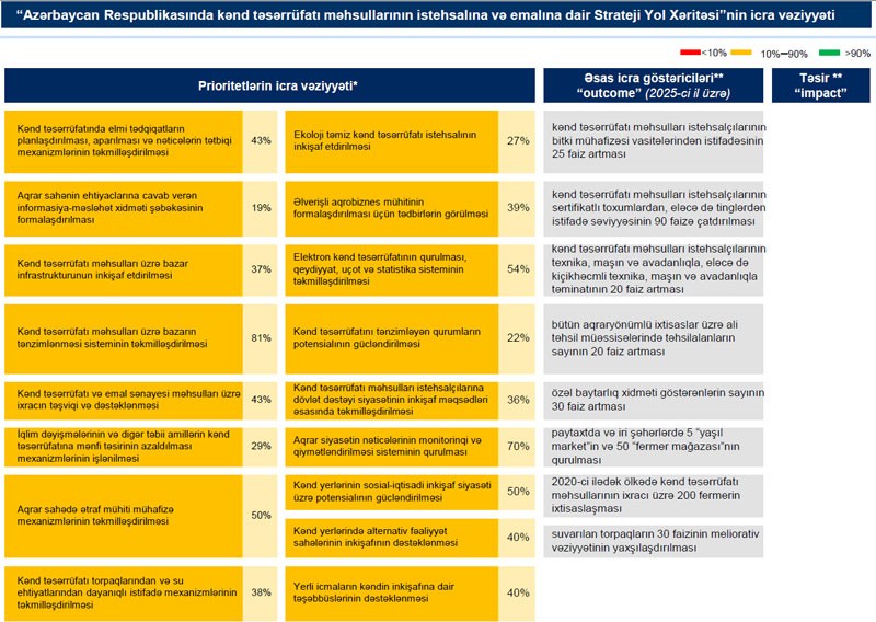 Azərbaycan Respublikasında kənd təsərrüfatı məhsullarının istehsalına və emalına dair Strateji Yol Xəritəsinin ikinci strateji hədəfi olan kənd təsərrüfatı məhsullarının istehsal potensialının dəyər zənciri üzrə artırılması hədəfinin icra səviyyəsi belə olub: 35 faiz tam icra, 24 faiz qismən icra və 41 faiz icra edilməyib. İnkişaf etmiş meyvəçilik və üzümçülük təsərrüfatlarının yaradılması üçün bu sahələr üzrə elmi əsaslandırılıb ixtisaslaşma tələb edildiyini nəzərə alaraq, respublika ərazisində üzümçülüyün və meyvəçiliyin inkişafı məqsədilə 10 təbii-iqtisadi zona, bu zonalarda becərilməsi üçün müvafiq rayonlaşdırılıb və perspektivli meyvə və üzüm sortları və istehsal olunan şərab məhsulunun növləri müəyyən edilib. İstehsalçılar tərəfindən emal müəssisələrinə təhvil verilən pambıq, barama və tütün məhsulunun həcminə görə subsidiya verilməsinə başlanılıb. Kənd təsərrüfatı kooperativlərinin yaradılması və qeydiyyatı prosedurlarının sadələşdirilməsi üzrə normativ hüquqi aktların təkmilləşdirilməsi baxımından müxtəlif ölkələrin təcrübələri araşdırlıb, habelə kənd təsərrüfatı kooperasiyası ilə bağlı mövcud qanunvericiliyin monitorinqi aparılıb.