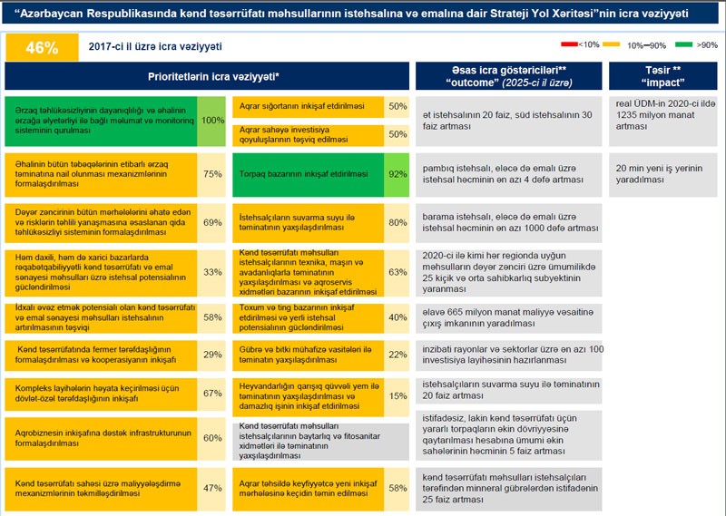 Azərbaycan Respublikasında kənd təsərrüfatı məhsullarının istehsalına və emalına dair Strateji Yol Xəritəsinin 2017-ci il üzrə icrasına dair monitorinq və qiymətləndirmə nəticələri ictimaiyyətə açıqlandı. Doqquz strateji hədəfdən ibarət olan bu Strateji Yol Xəritəsinin ümumi icra vəziyyəti 46 faizdir.