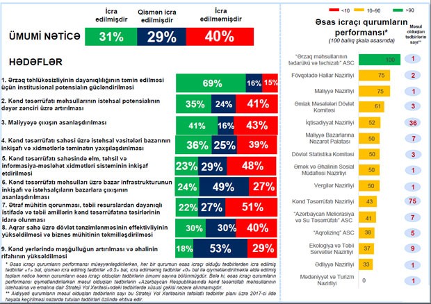 Əsas icraçı qurumların performansına gəldikdə isə “Ərzaq məhsullarının tədarükü və təchizatı” ASC, kənd təsərrüfatı məhsullarının istehsalına və emalına dair Strateji Yol Xəritəsində 2017-ci ildə nəzərdə tutulan tədbirlərin 100 faizini yerinə yetirib. Fövqəladə Hallar Nazirliyi və Maliyyə Nazirliyinin icra göstəricisi isə 75 faizdir. Əmlak Məsələləri Dövlət Komitəsi və İqtisadiyyat Nazirliyi qeyd edilən dövr ərzində nəzərdə tutulan tədbirlərin müvafiq olaraq 61 və 52 faizini yerinə yetiriblər. Maliyyə Bazarlarına Nəzarət Palatası, Dövlət Statistika Komitəsi, Əmək və Əhalinin Sosial Müdafiəsi Nazirliyi və Vergilər Nazirliyi, hər biri, 50 faizlik icra göstəricisinə malikdirlər. Kənd Təsərrüfatı Nazirliyi, Meliorasiya və Su Təsərrüfatı ASC, “Aqrolizinq” ASC, Ekologiya və Təbii Sərvətlər Nazirliyi, Ədliyyə Nazirliyi müvafiq olaraq 43 faiz, 41 faiz, 38 faiz, 37 faiz və 33 faiz icra göstəricilərinə malikdirlər.