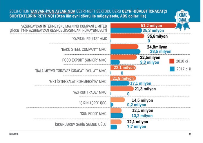 “İxrac İcmalı”nın iyul sayında qeyri-neft sektoru üzrə əsas ixracatçı subyektlərin reytinqi də verilib. 2018-ci ilin yanvar-iyun aylarında qeyri-neft sektoru üzrə qeyri-dövlət ixracatçı şirkətlərin siyahısında ilk onluqda “Azərbaycan İnterneyşnl Mayninq Kompani Limited Şirkəti”nin Azərbaycandakı nümayəndəliyi, "Kapitan Fruits" MMC, "Baku Steel Company" MMC, “Food Export Şəmkir” MMC, "Qala meyvə-tərəvəz ixracat idxalat" MMC, "MKT İstehsalat Kommersiya" MMC, “Azfruittrade” MMC, “Şirin Aqro” QSC, "Sun Food" MMC, İskəndərov Sahib Səməd oğlu təmsil olunub.